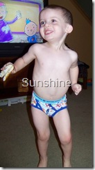 Wow, things have been crazy around here lately. We have been potty training Cameron and I am thinking that he finally has the hang of it. It took about a month to get him to the point to tell us that he has to go instead of us just keeping him on a routine about going, but we are thankful that he is FINALLY there. He might have an accident here and there and we are still not wearing undies at bedtime, but that is all to be expected for a little while or at least that is what I think (lol). He wears a large variety of undies. We have our Mickey Mouse undies and then we have undies just like Daddy. It is too cute seeing Daddy and Cameron run around in their boxer briefs in the early morning or late evening before bedtime. Shhh, don’t tell Shawn that I told you that he wears boxer briefs or he might turn a little red (lol). So, do you want to see some pics of Cameron in his cute little undies? I must admit that he is just too stinkin cute!!